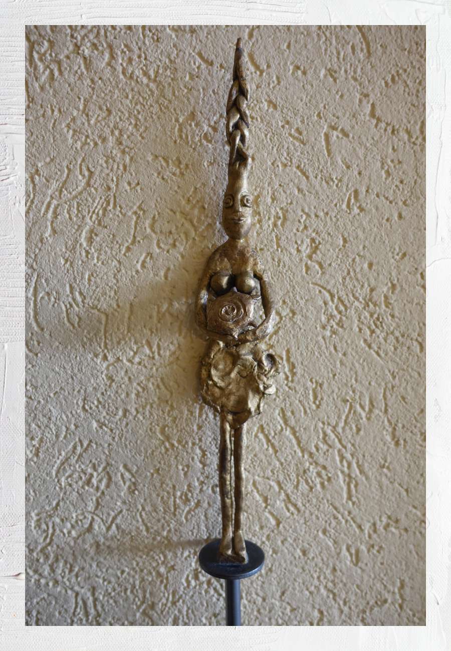 Auftragsarbeit ( 2017) an Isolden (Künstlername), Unikat, Bronze-Guß (nach Wachsform, Gießerei Niedermeier), Titel "Ariadne", die hier statt des Knäuels aus dem selbst gesponnenen Faden (mit dessen Hilfe Theseus den Weg aus dem Labyrinth des Minotauros fand) eine Schildkröte hält. Die Gestalt aus der griechischen Mythologie steht auch für weibliche Stärke, Intuition und Weisheit. Die Figur
