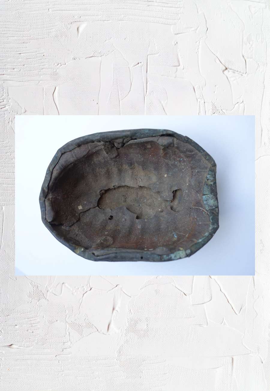 Dies ist eine Kapala (Sanskrit für "Schädel", aber auch für "Schildkröte"), die von einer religiösen Gemeinschaft bei geheimen Ritualen als Trinkgefäß verwendet wurde. Das Objekt ist aus der Familie eines Oberpriesters der Bajrachya (Nepal) überliefert und basiert auf einem mit Kupfer überzogenen Schildkrötenpanzer. Da sich das Material auf der hier gezeigten Innenseite spürbar zersetzt hat, ist es ein Kultgegenstand von beträchtlichem Alter, Größe 15 cm.