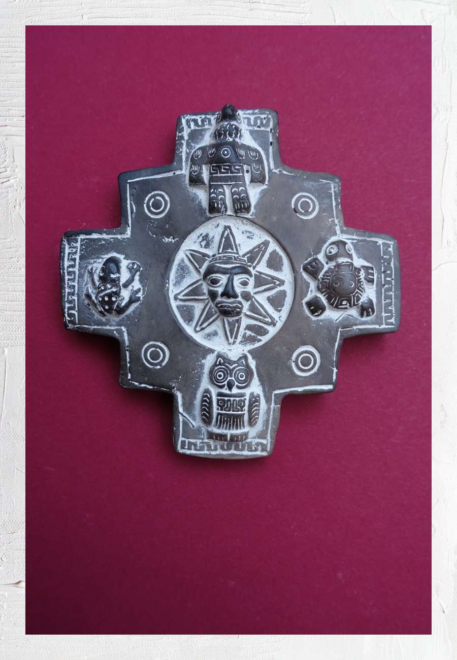 Inkareiches (heute Peru). Condor, Schildkröte, Eule und Kröte zeigen die Himmelsrichtungen an. Sarah hat diese Replik vom Mercado de Brujas (Hexenmarkt) in La Paz