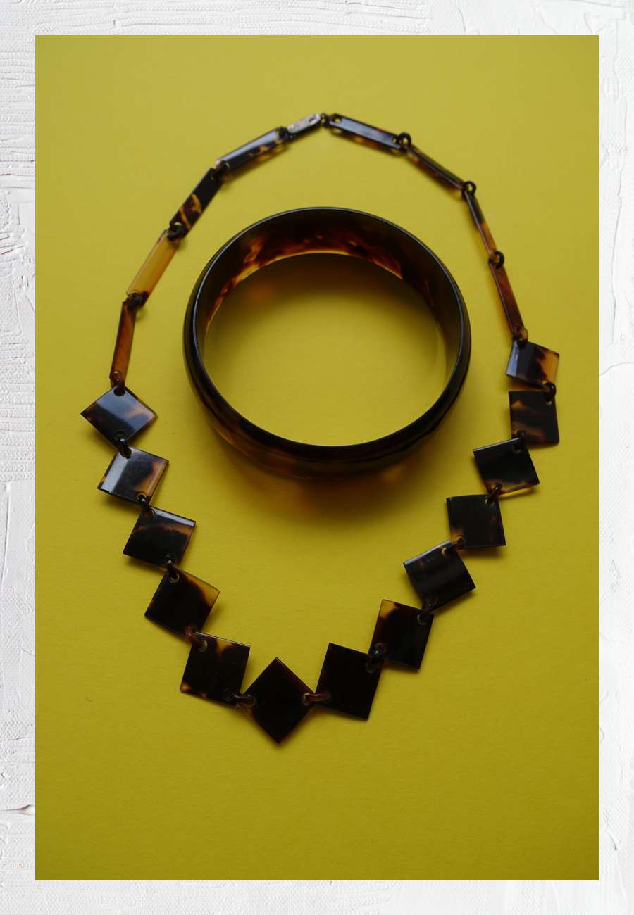 Geschenk einer 80-jährigen Dame, deren Eltern vormals in Brasilien lebten. Sie wollte die Kette und den Armreif (aus dem Schildpatt einer Meeresschildkröte) ihrer Mutter, lange als wichtiges Andenken verwahrt, rechtzeitig in guten Händen wissen.