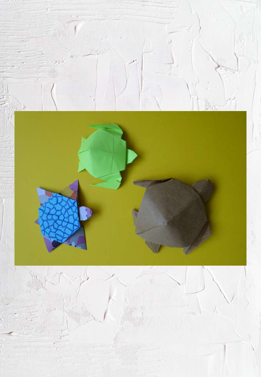 Origami, Papierfaltkunst in drei Varianten, rechts eine Auftragsarbeit an den Papierdesigner