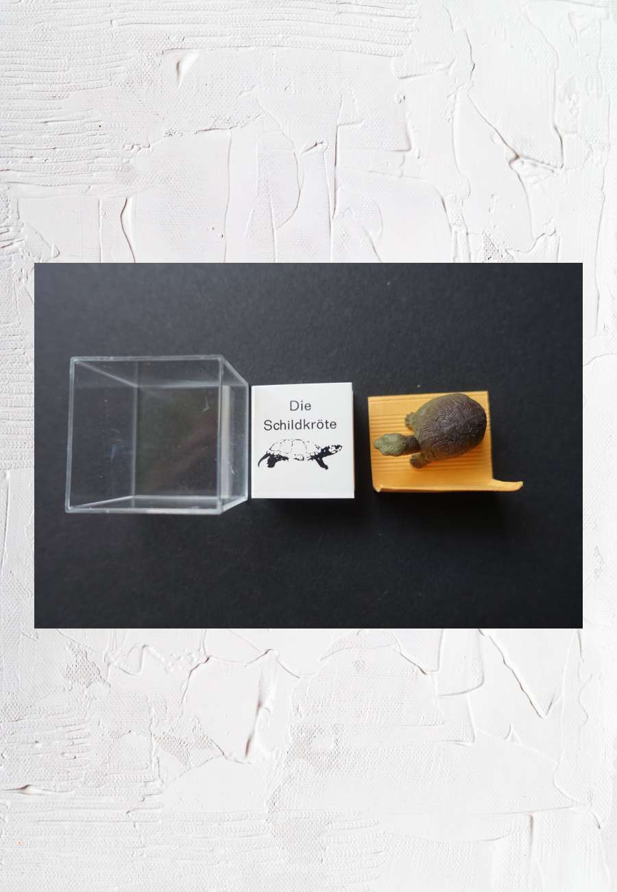 Das Mini-Büchlein "Die Schildkröte" enthält das gleichnamige Gedicht von Christian Morgenstern. Es steckt zusammen mit einer Mini-Schildkröte in einem Plexiglaskästchen, Größe 2,5 x 2,5 cm, gestaltet als Leporello von der Schriftsetzer-Meisterin der "Handsatzwerkstatt Fliegenkopf".