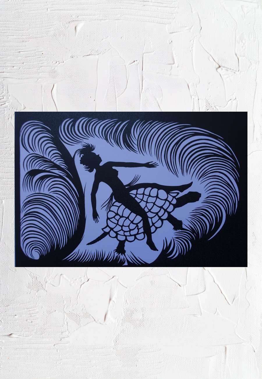 Ein anmutiges Mädchen reitet in dieser kreativen Scherenschnitt-Arbeit auf einer großen Schildkröte mutig durch Wellenberge, Format