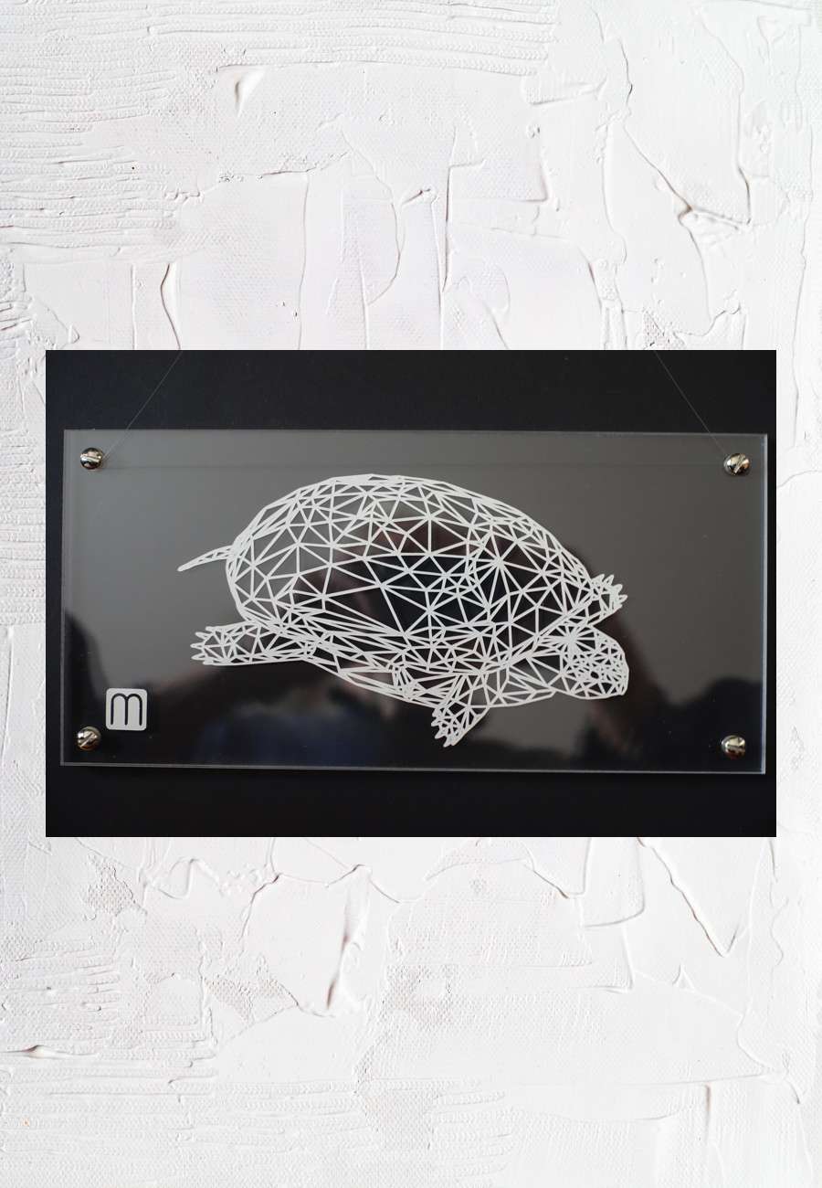 Möglichkeiten bietet der Laser-Schnitt. Es gibt von diesem Motiv zwei Varianten, als Papierschnitt (farbig hinterlegt) und hier zwischen Plexiglas schwebend. Die Dänin hat eine sichtbare Vorliebe für Mathematik und Kunst. Sie firmiert mit "m" für monastine, Format 25 x 12 cm.
