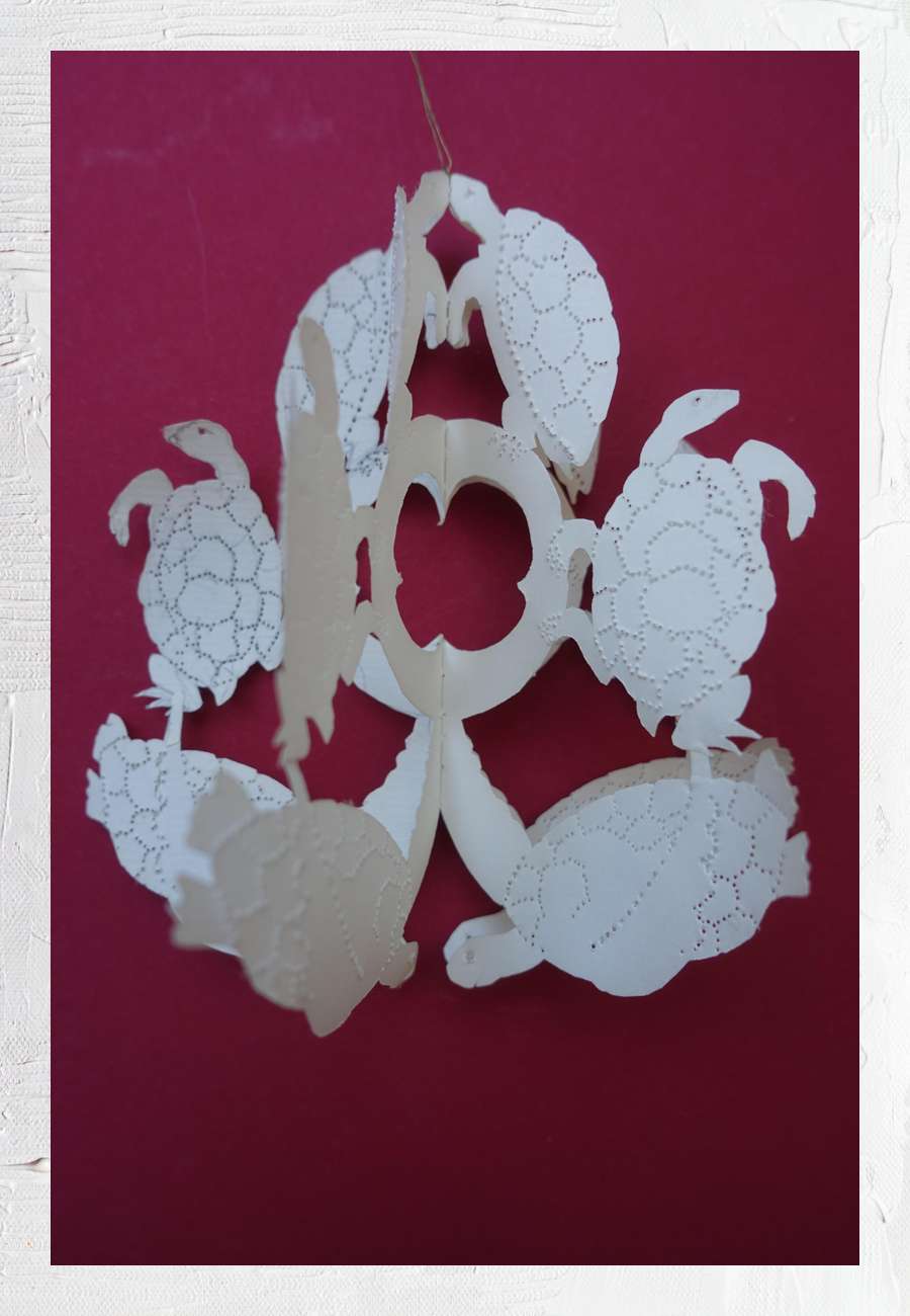 Auftragsarbeit, dreidimensional gefalteter Papierschnitt, hier mit 12 Schildkrötchen, Größe 12 cm.