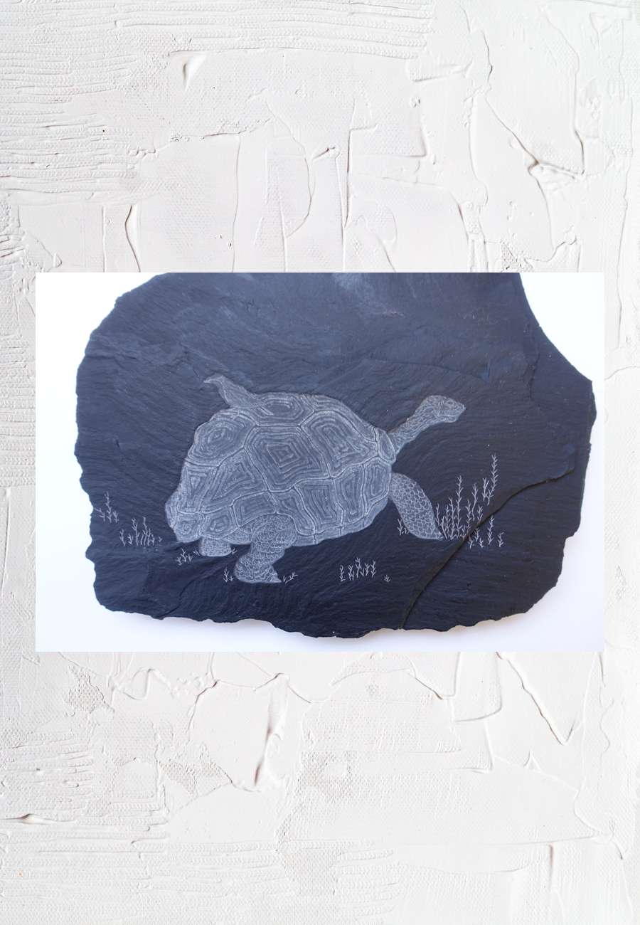 Schieferplatte, die Galapagos-Schildkröte ist sorgfältig und naturgetreu eingraviert, Größe ca. 16 x 13 cm. Vögel nutzen den hohen Panzer gern als Ausguck, befreien die Schildkröte aber auch von Parasiten.