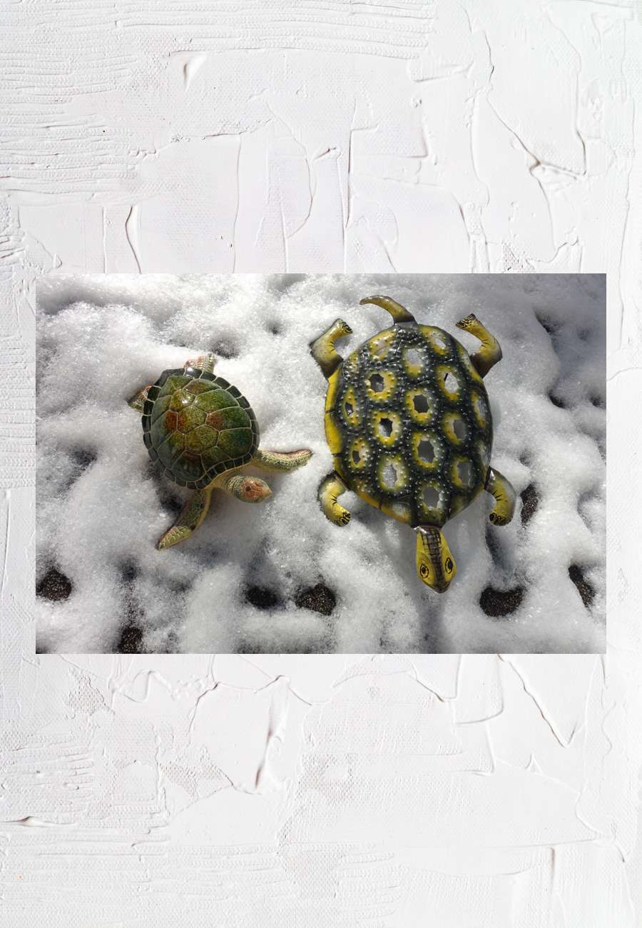 Links eine Grüne Meeresschildkröte (wegen ihrer Verwendung auch als Suppenschildkröte bezeichnet), aus Metall gegossen, in Form und Farbe ziemlich