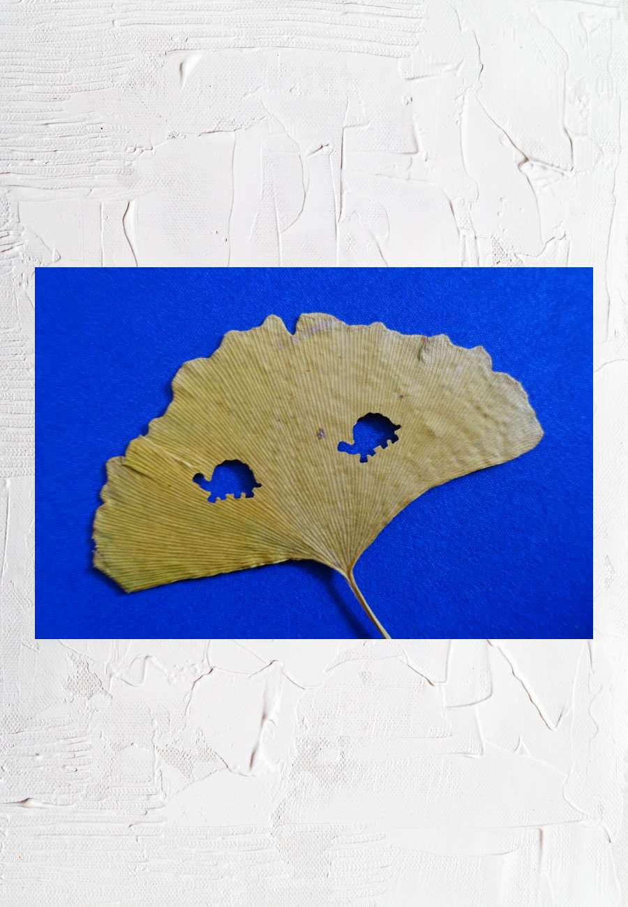 Collage, selbst gepresstes Ginkgo-Blatt (10,7 cm breit), mit zwei ausgestanzten Schildkrötchen, inspiriert durch die ausgezeichnete Arbeit von Hermann Bigelmayr. Es wirkt wie ein Wunder der Natur, dass sich kein Blatt genau gleicht, ähnlich unserer Fingerabdrücke. Bis heute schreibt man dem ältesten Baum der Welt (einer Zwischenform von Nadel- und Laubbaum) geistige und heilende Kräfte zu und von Goethe stammt das Gedicht mit dem Titel "Ginkgo biloba", beginnend mit "Dieses Baums