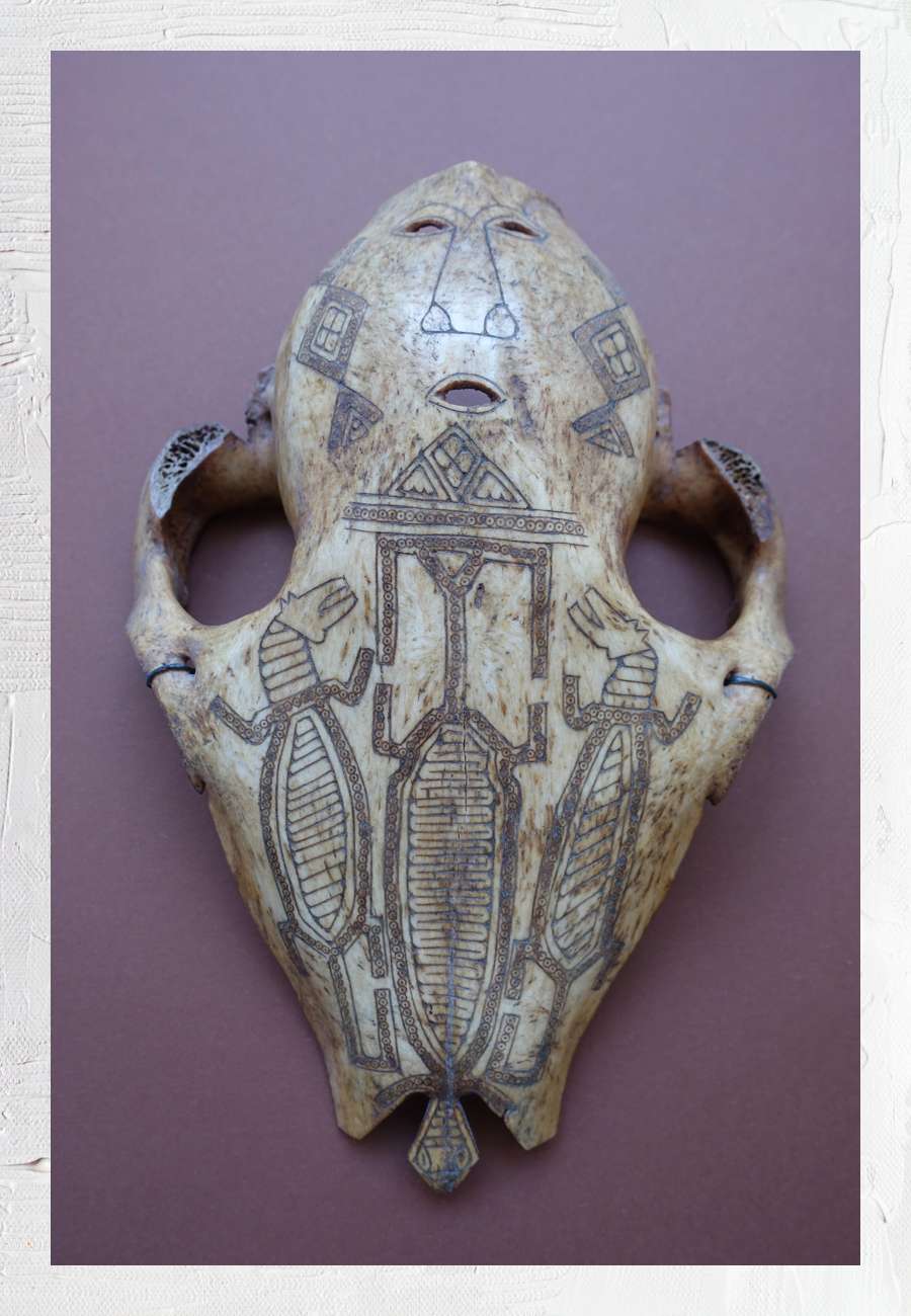 Diese alte Schädeldecke eines Warans von der Insel Flores ist eine besondere Rarität. Eingraviert sind stilistisch reduziert: ein