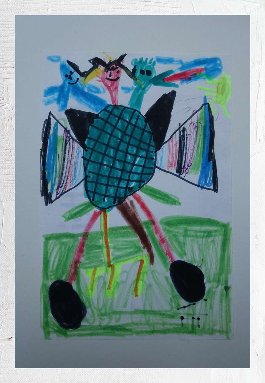 Zeichnung mit Filzstiften, Fabeltier mit 3 Köpfen, Flügeln und einem Schildkrötenpanzer, Format DIN A 6, Alter 7 Jahre.