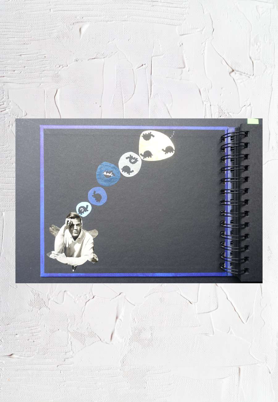Künstlerbuch, Unikat, Titel " Die Geschichte von Priesemut + Freitag + Irgendwie Anders", mit eigenem Text, Collagen und Fotos, 46 Seiten, Format 22,5 x 18 cm. In den Gedankenblasen steckt der Text "I had a Dream...." ( vielleicht ein Jugendtraum ?).