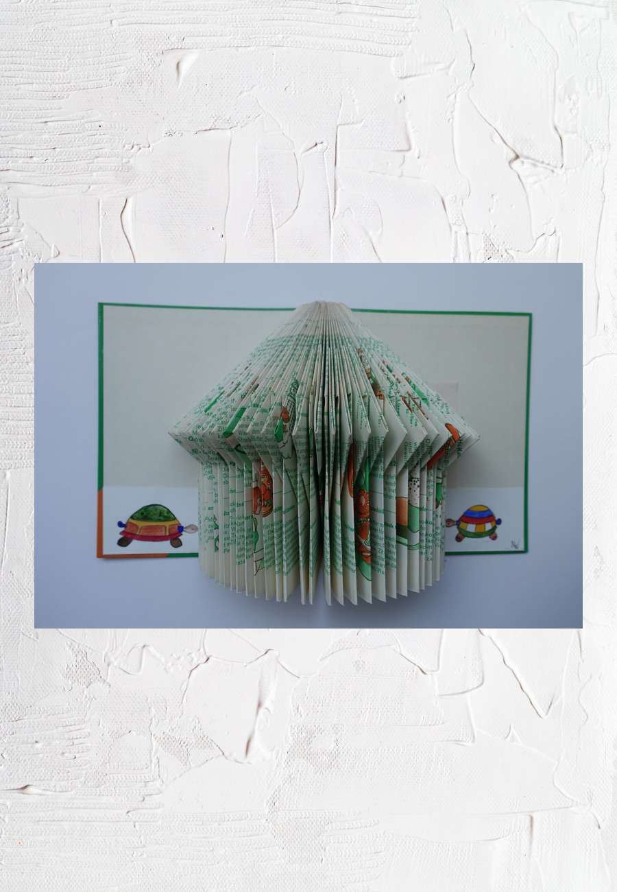 Ursprünglich ein Diät-Kochbuch, 92 Seiten (46 Blätter), sign., Format geöffnet 34 x 19 cm. Durch die Faltung verwandelt sich das Buch in eine Skulptur und wurde für mich mit 2 Schildkröten bemalt, die in das Häuschen streben.