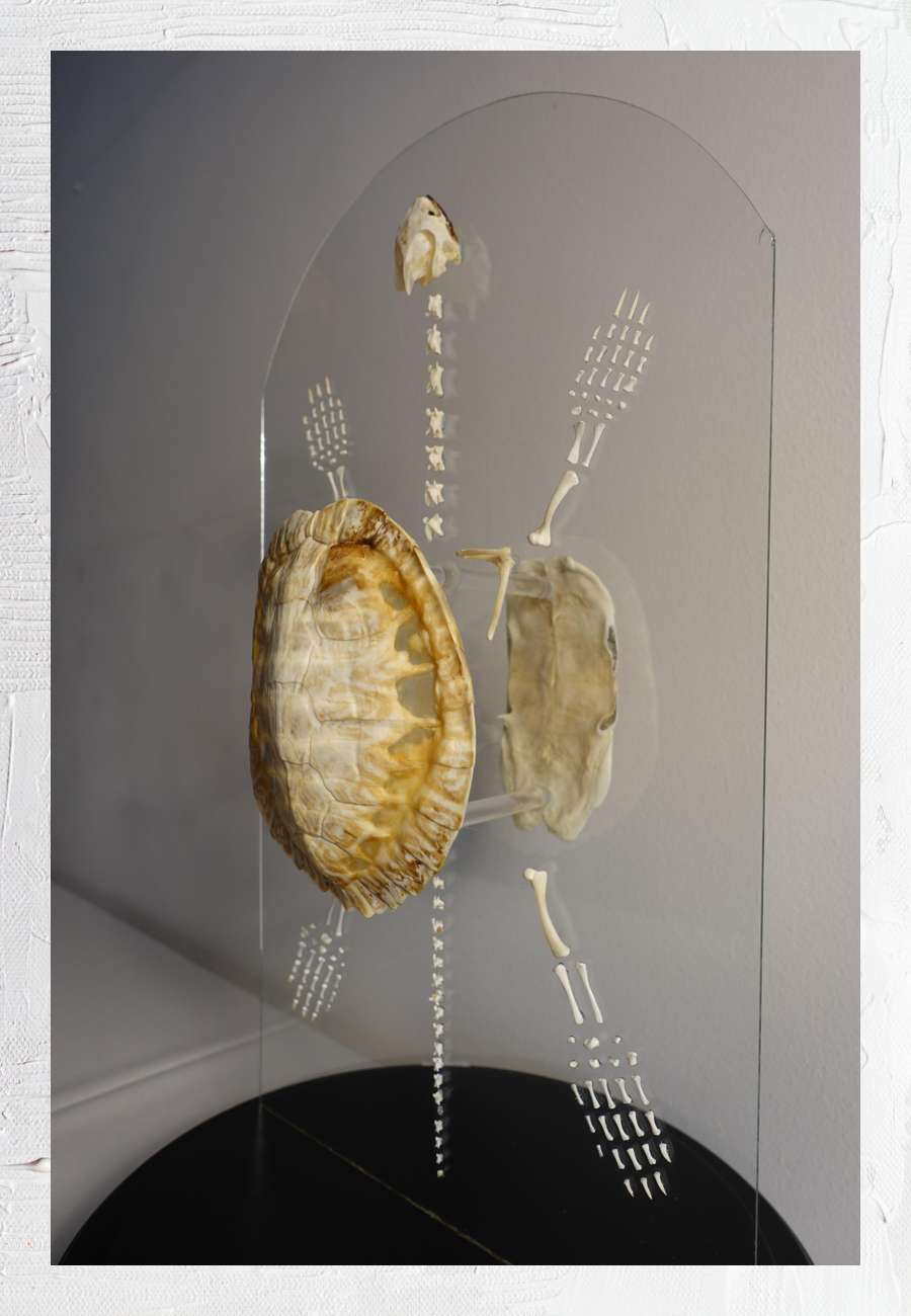 Skelett der schon beschriebenen Wasserschildkröte, auf Glas montiert. Hier sieht man gut den dreidimensionalen Effekt. Allein anhand der Füße ist auch zu beobachten, dass sich die Evolution immer wieder bewährter Muster bedient (vergleiche Reptilien, Säugetiere oder menschliche Hände). Dies ist geradezu ein Geniestreich der