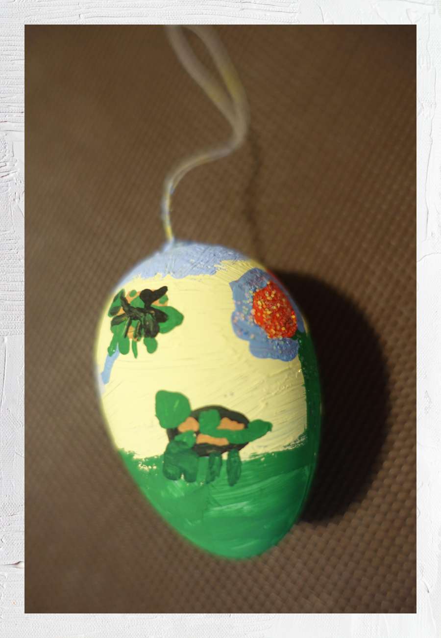 Oster-Ei, liebevoll bemalt, Motive sind u.a. Schildkröte , Blume, Himmel, Herz und ein Kind mit Luftballon, Alter 7 Jahre.