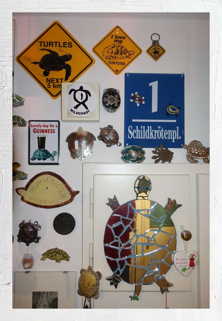 Flur, Hausnummer "Schildkröten-Platz 1", mit Spiegel, acht Gürtelschnallen, Schildern, Sticker von Wildcoast und weiteren Objekten.