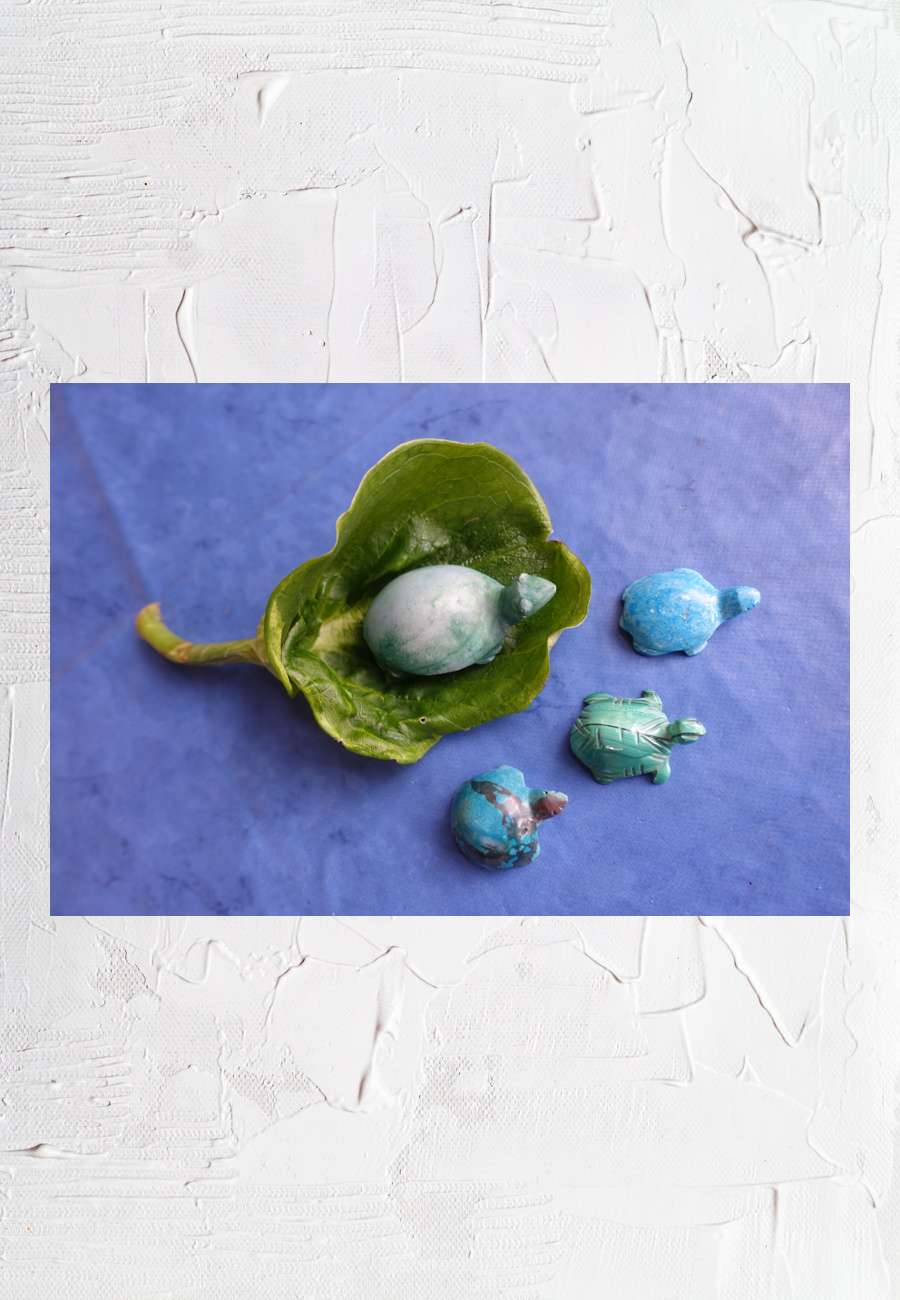 Alle Objekte sind trotz der Farbabweichungen aus Türkis, einem relativ seltenen Mineral, das zu den ältesten Schmucksteinen zählt und u.a. in Ägypten, Iran , Tibet, China und im Südwesten der USA abgebaut wird. Bei den sog. "Native Americans" (z.B. Azteken, Navajo, Zuni) hatte der Türkis eine spirituelle Bedeutung als Amulett, Schutz- oder Heilstein.