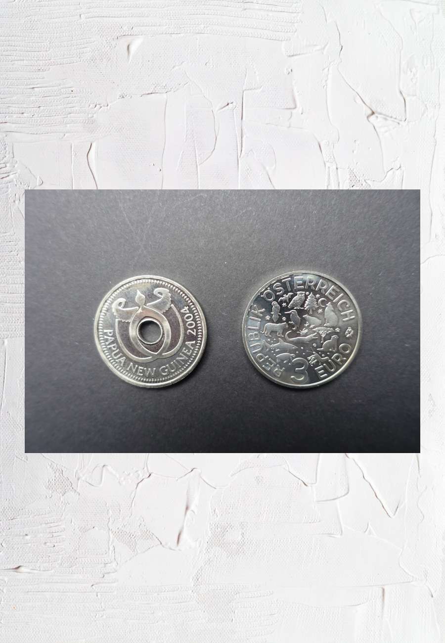 Links: Papua Neuguinea, 1 K, 2004, rückseitig 2 Krokodile, Durchmesser 3,3 cm. Rechts: Österreich, Kupfer-Nickel, 3 Euro, 2018, Durchmesser 3,4 cm,