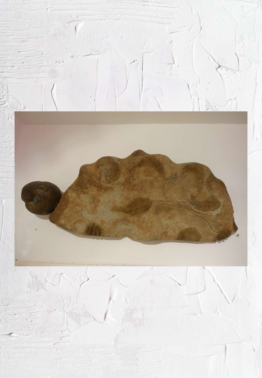 Nahezu naturbelassener Sandstein (Fundort bei Schärding/Inn), nur die angedeuteten Füße sind eingekerbt. Der Kugelkopf ist vulkanischen Ursprungs, das