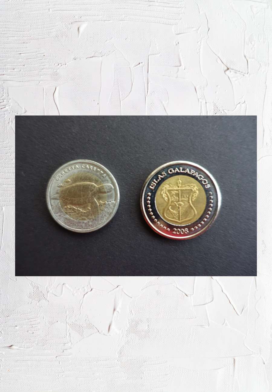 Rechts: Galapagos (Ecuador), 50 Centavos, 2008, Durchmesser 3,1 cm, im Wappen u.a. eine kleine Schildkröte und rückseitig ein endemischer Vogel.
