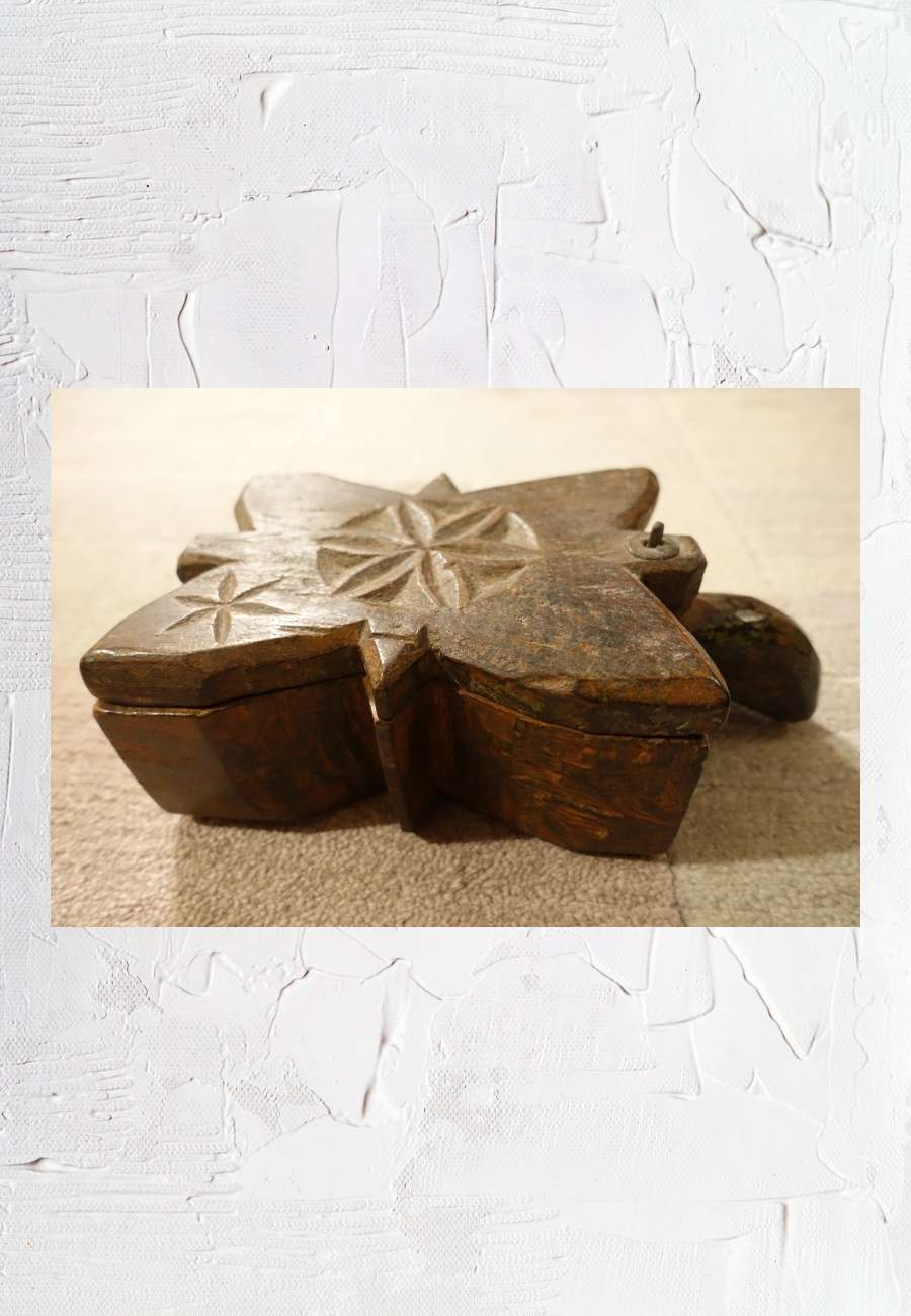Holzdose für verschiedene Gewürze. Das Scharnier oberhalb des Kopfes (der zugleich als Handgriff dient) ermöglicht den Deckel seitwärts zu schwenken.
