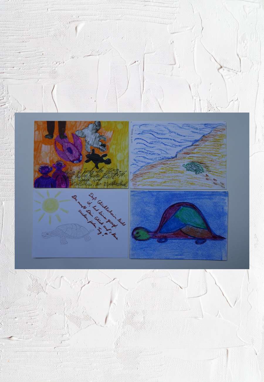 Arbeiten einer Kunsttherapie-Gruppe (von links oben im Uhrzeigersinn): Volker, Georg, Manuela, Natascha.