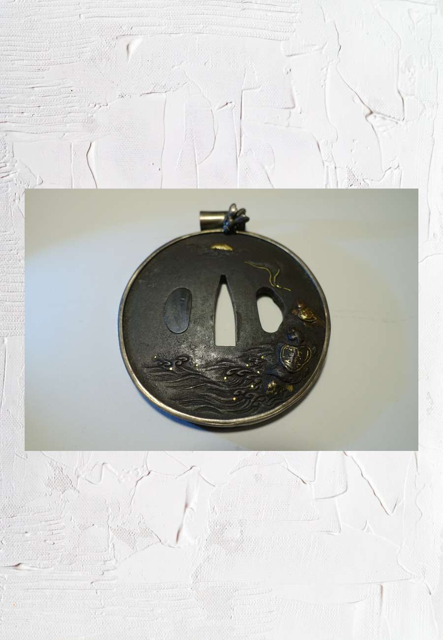 traditionellen Samurai-Schwertes, im Feudalsystem Japans eine standesbezogene Waffe (Edo-Zeit, um 1850). Es sitzt zwischen Handgriff und Klinge. Die leicht ovale Platte (Durchmesser ca. 7 cm) besteht aus einer Kupferlegierung und Tauschierungen aus Gold, mit kunstvollen Verzierungen, hier sind es u.a. zwei Schildkröten in Form der Minogame. Auch die Rückseite ist künstlerisch gestaltet. Durch die mittige Aussparung wird die Angel des Schwertes geführt, die kleinere dient der Aufnahme des Beimessers (Kozuka). Das Tsuba ist von der Goldschmiedin Aglaia Köster als