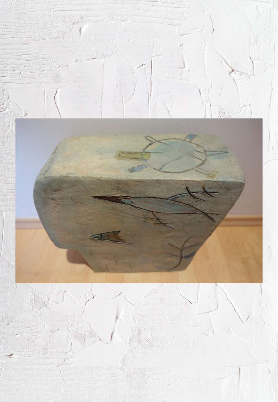 Der blockartige, stark abstrahierte Kopf symbolisiert die Poesie, eine Arbeit aus der "Kolumbus-Serie", Unikat, aus Ton aufgebaut, mit eingravierten Motiven auf allen Seiten, bemalt und zweifach gebrannt, sign. Die Schildkröte steht hier für Dauer und das Element Erde, der Vogelfisch für Wasser, Luft und Freiheit. Höhe 43 cm, Breite 38 cm, Tiefe 15 cm, siehe auch weitere Arbeiten der Künstlerin.