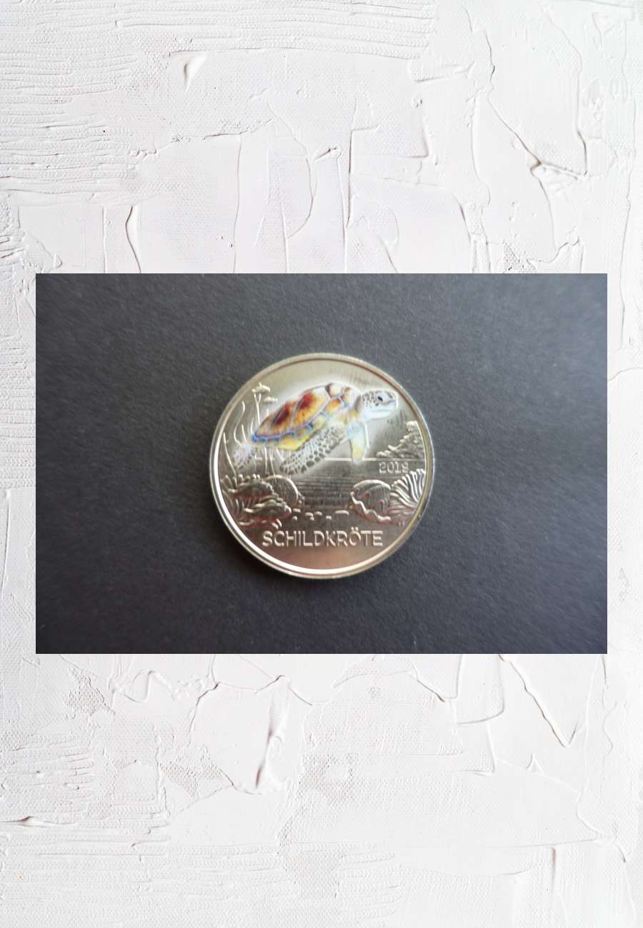 Österreich, 3 Euro (!), Kupfer-Nickel, 2019, Durchmesser 3,4 cm, Gewicht 16 Gramm, Auflage nur 50.000 Exemplare, Serie Tier-Taler, Motiv: Meeresschildkröte, Fische, Muschel