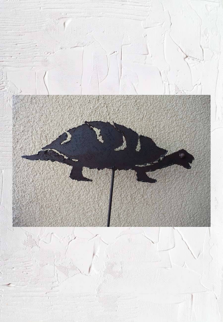 "Brotberuf"). Die Schildkröte ist 45 cm lang, aus einer Eisenplatte (0,6 cm) per Laser ausgeschnitten. Sie steht auf einem hohen Stab mit massivem Sockel und läßt sich schwingen, Gesamthöhe 148 cm.