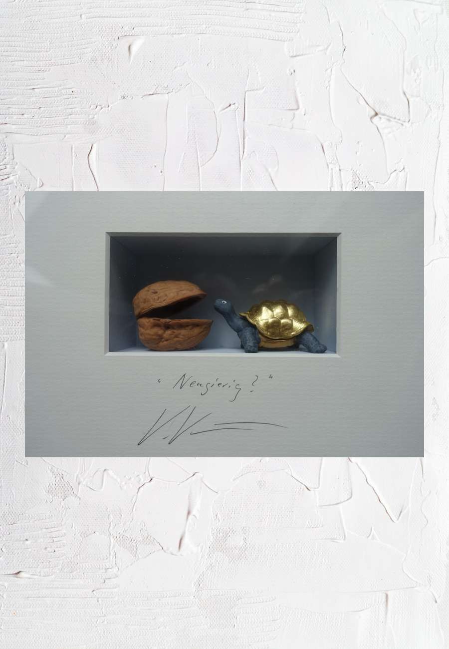 Vitrinenartiger Schaukasten aus Holz, Format gerahmt 29 x 25 cm, Titel "Neugierig?", sign. Zu seinen dreidimensionalen Objekt-Bildern gibt es ein originelles Buch "Collection Band 1, Die