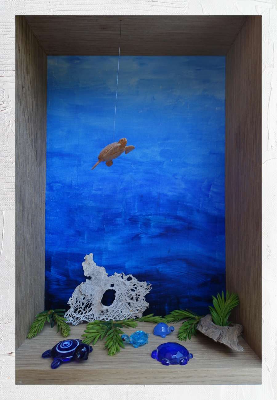 Auftragsarbeit, nach einer Entwurfszeichnung, naturbelassener Holzkasten (28 x 20 x 8 cm), in dem die handgeschnitzte Miniatur (Linde, ca. 4 cm, sign.) an einem Nylonfaden schwebt. Um Illusionen zu wecken, ist die Innenseite meerähnlich bemalt. Der erste Kontakt zu der jungen Künstlerin (Städtische Meisterschule für das Holzbildhauerhandwerk, München) erfolgte auf der Internationalen Handwerksmesse. Die Dekoration unten habe ich für dieses Foto zugefügt. Bei dem Wettbewerb "Krippe" der