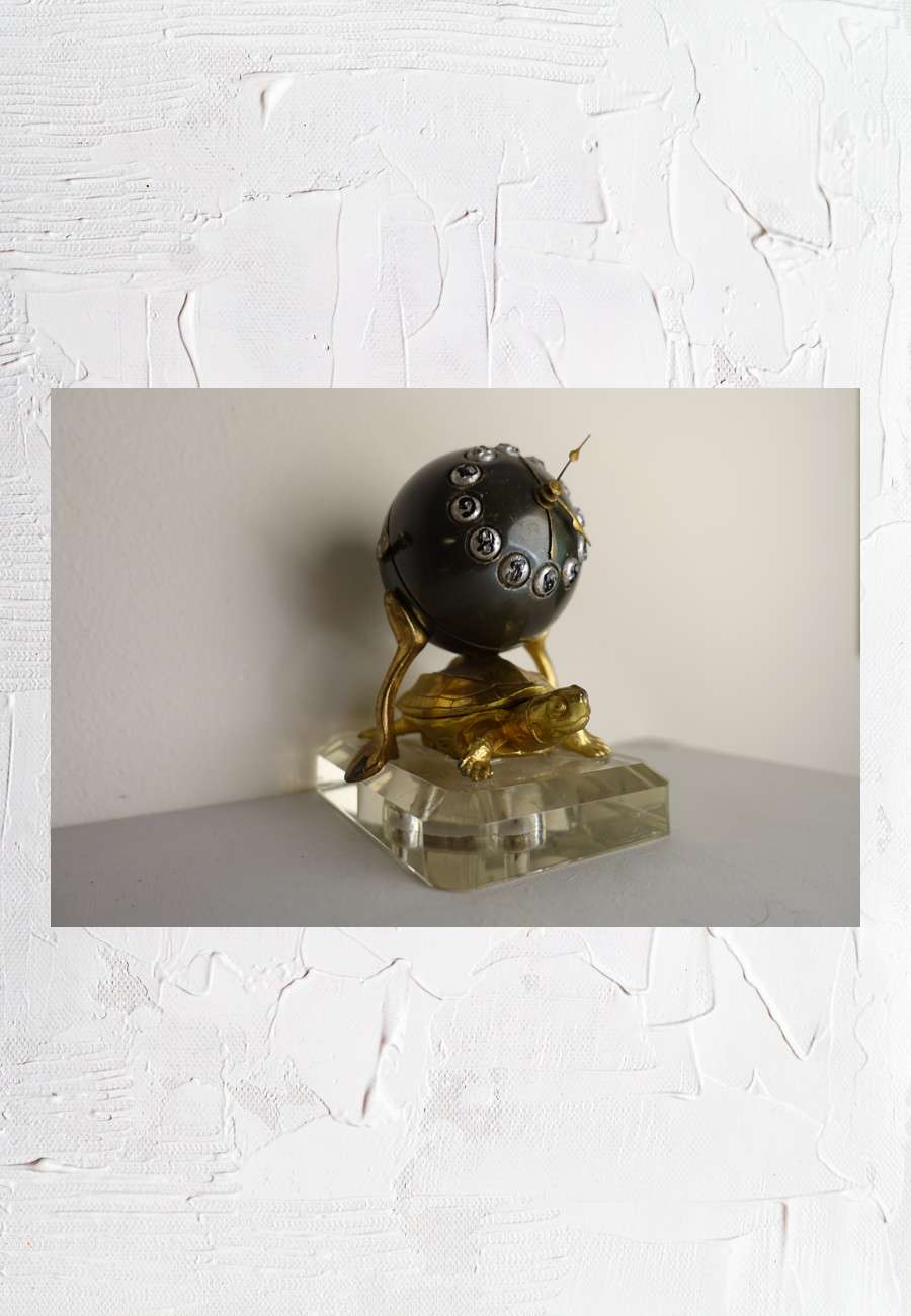 Die Schildkröte (Goldbronze) auf einem Acrylsockel, 9 x 7 cm und 11 cm hoch, trägt den Erdball (Metallkugel mit Ziffernblatt), in dem sich das Uhrwerk (sign. RE VE) befindet. Weltweit symbolisiert die Schildkröte in vielen Kulturen u.a. Stabilität und Langlebigkeit.