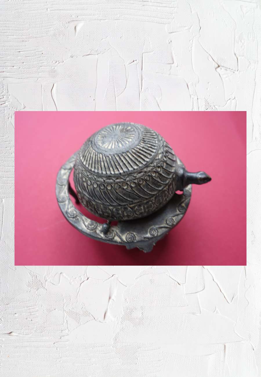 Aschenbecher, Bronzeguß, Sockel mit drei geschwungenen Beinen, der kugelförmige Panzer läßt sich am Kopf komplett nach unten aufklappen, innen ein herausnehmbarer Einsatz für die Ablage von Zigaretten und Asche, ein älteres und seltenes Stück, Durchmesser 14 cm, Höhe 11 cm.