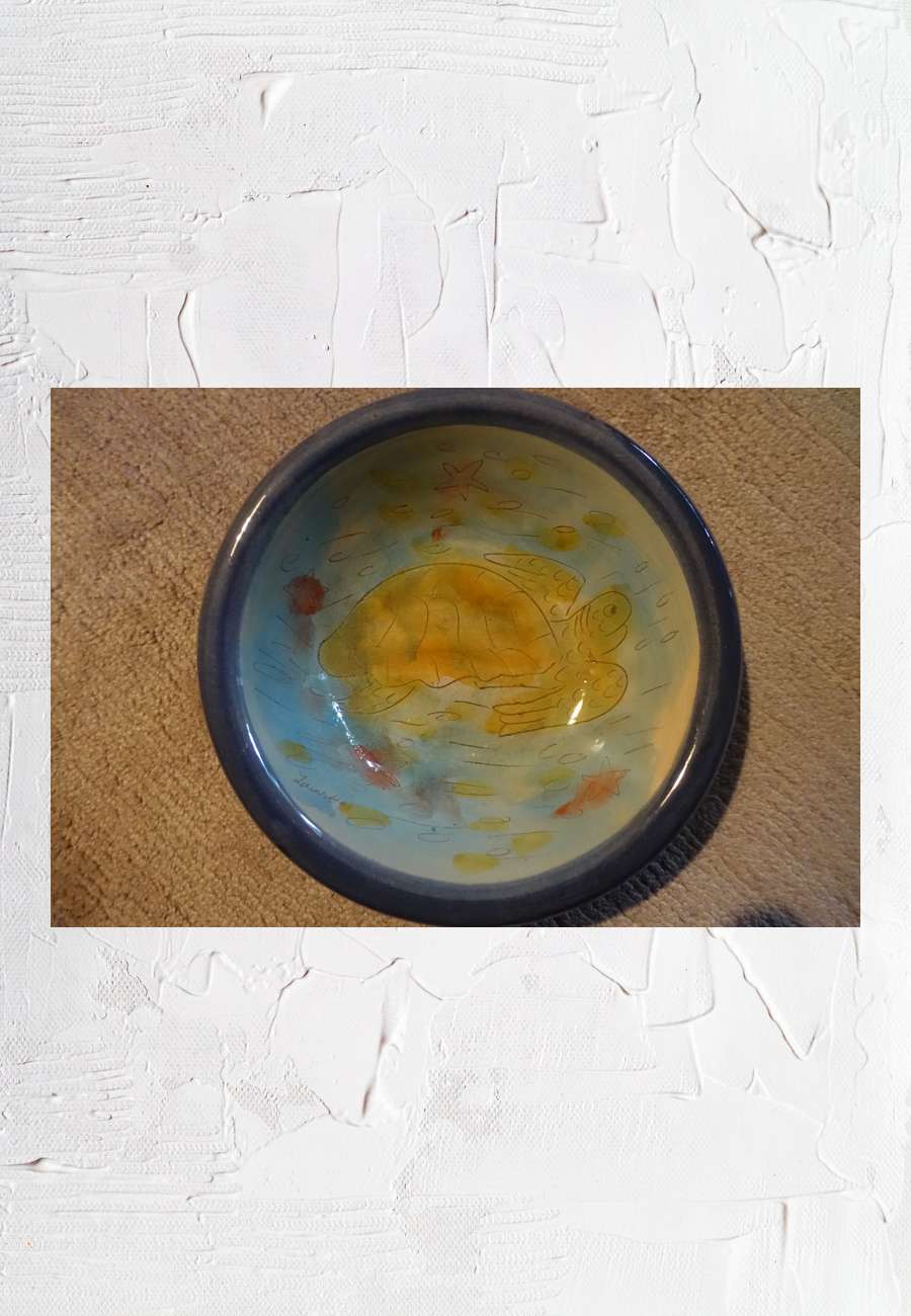 Schale, getöpfert und handbemalt, Unikat, sign., Durchmesser 24 cm, Höhe 7 cm.