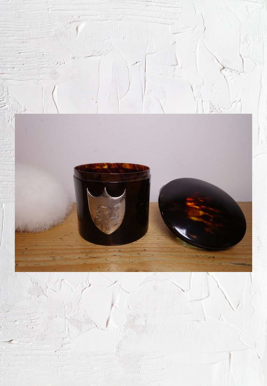 Puderdose aus Schildpatt der Echten Karettschildkröte, Quaste (Marabudaune) und Wappen (Silber, 925), London 1923, Durchmesser 8,5 cm. Erworben auf der Kunst- und Antiquitätenmesse Nockerberg (München).