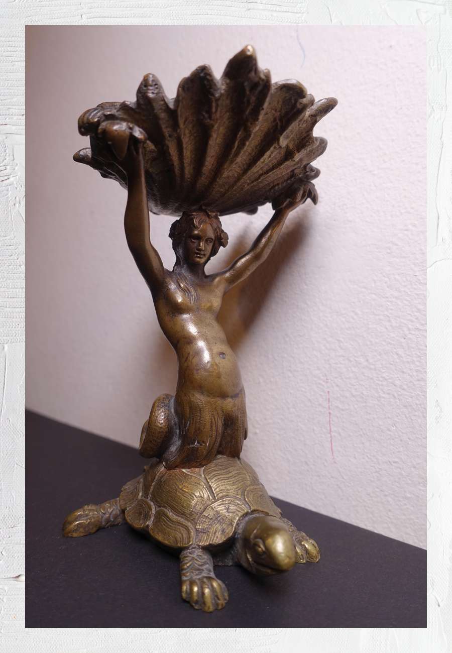Bronze aus Florenz, Höhe 11,5 cm. Das Objekt ist eines von 15 aus meiner Sammlung, das in dem schon genannten Buch von Alexander Lauterwasser abgebildet ist. Dessen verkürztes Zitat dazu: "ein gutes Beispiel der Polarität von konvexer Geschlossenheit (Panzer) und konkaver Offenheit (Muschelschale)".