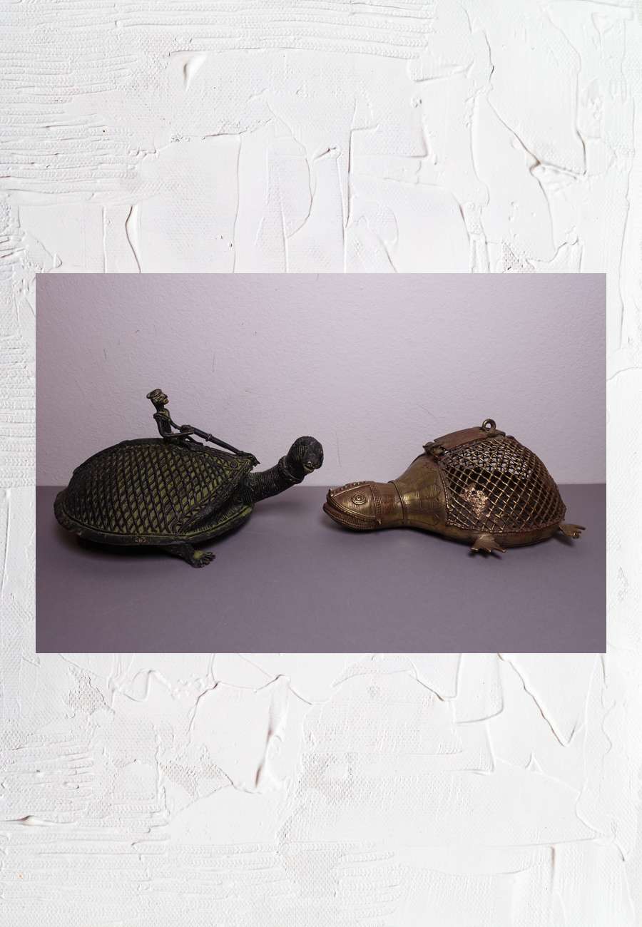 Links: Bronzguss aus Indien, ca. 17 cm, wobei sich bei dem Motiv die Frage stellt, ob die Schildkröte mit dem langen Stab angetrieben wird? Gleichzeitig gibt es eine erstaunliche Verwandtschaft zu Metallgüssen der Senufo (Mali). Rechts: kunstvoll durchbrochene Skulptur aus Messing, ca. 16 cm., der Verschluß läßt