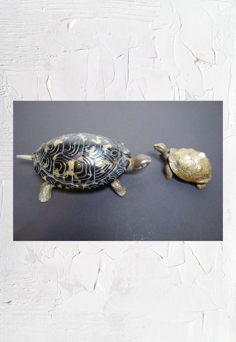 Links: Tischklingel, mechanisch aufziehbar, Unterbau aus Metall (in der Bodenplatte ist "Germany" eingegossen). Der Panzer ist aus Bakelit, dies war der erste industiell produzierte Kunststoff. Das Objekt stammt wohl aus den 1930er Jahren, Größe 17 cm. Ein kräftiger Klingelton wird durch drücken von Kopf oder