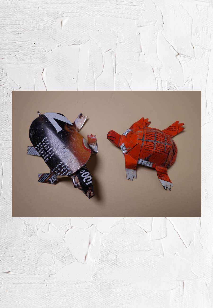 Zwei kleine Arbeiten aus Blechabfällen (Kaffee bzw. Mückenschutz, französischer Herkunft), Größe 10 bzw. 7 cm, von Wüstenbewohnern gesammelt und verarbeitet, als Kinderspielzeug