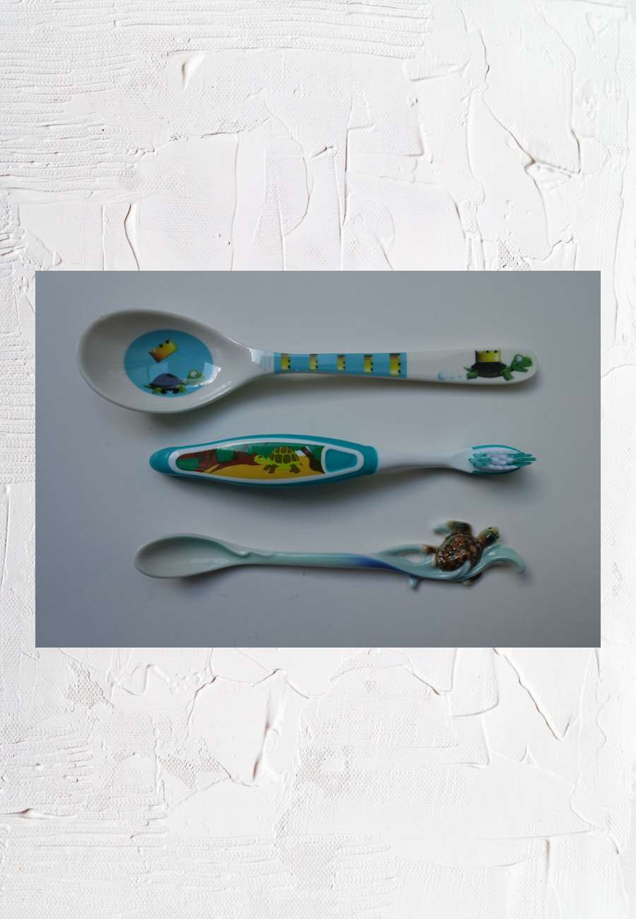 Kinderlöffel und Kinderzahnbürste sind aus Plastik, der Kaffeelöffel aus Porzellan (Fa. Franz, made in China).