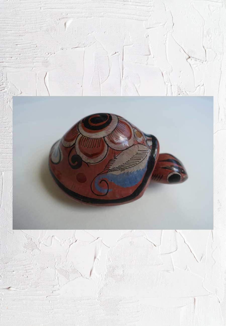 Kleine Keramikskulptur, handgetöpfert und hübsch bemalt, sign. G.R., aus Mexiko, mit beweglichem Kopf, Größe 12 cm. Dies ist überhaupt das erste, 1966 selbst gekaufte Stück, aus dem kleinen Geschäft von Brigitte Dobisch (das man heute als Dritte-Welt-Laden bezeichnen würde) in Würzburg. Es war als gelegentliches Mitbringsel gedacht, wurde dann aber nie verschenkt, d.h. die gesamte Sammlung ist zunächst zufällig entstanden. Der Kreis schloß sich viele Jahre später über den Kauf eines Seidenteppichs (Motiv nach einem Gemälde von Osman Hamdi Bey, s. Kategorie: Fotos).