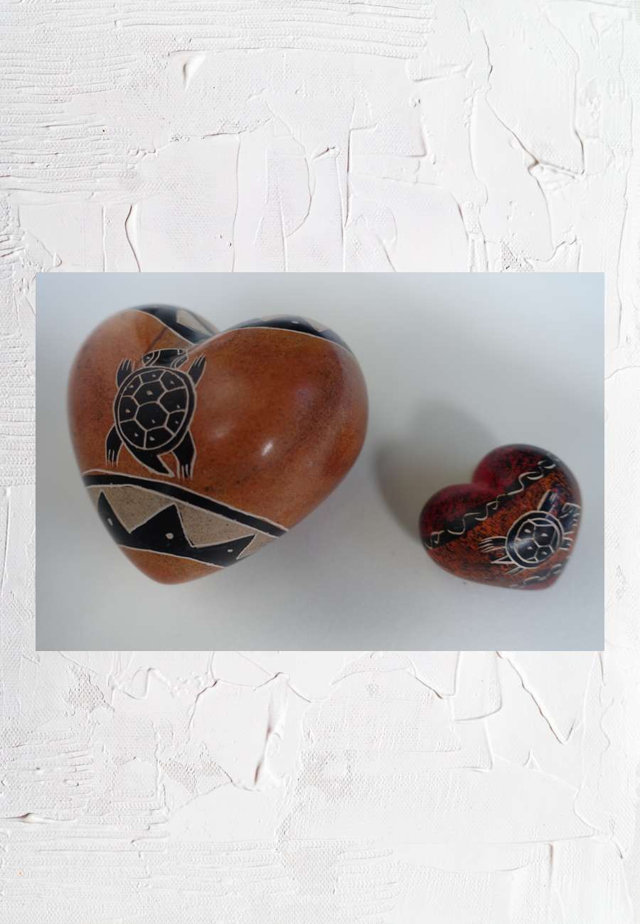 Das Schildkrötenmotiv findet sich auch auf Herzen aus Speckstein, Breite ca. 7 bzw. 3,5 cm.