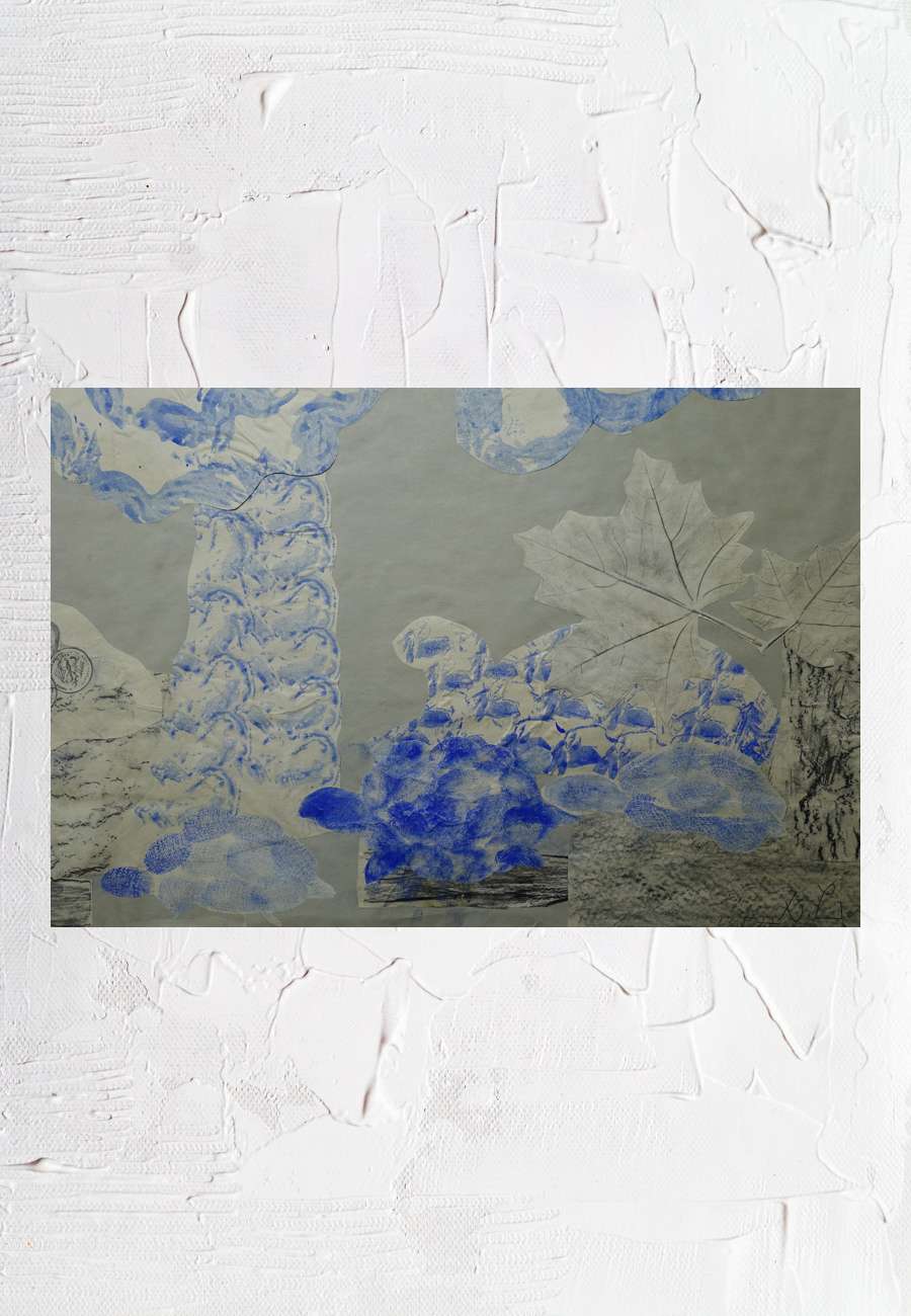 Bildausschnitt, u.a. mit 4 Schildkröten, entstanden 1977 aus Fingerabdrucken, Abreibungen, Aquarell und Graphit, sign., Größe 70 x 50 cm.