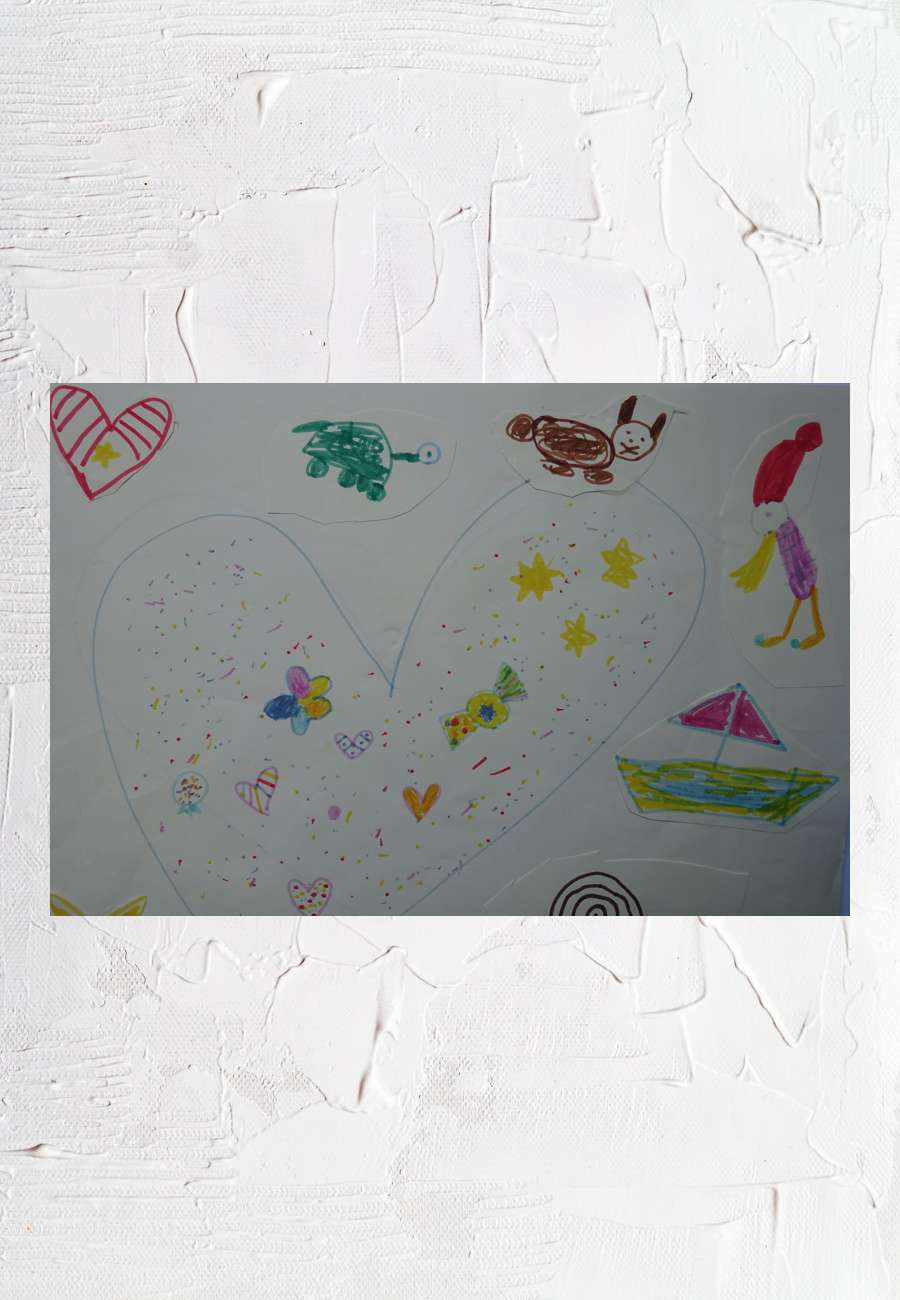 Collage mit Farbstiften, Ausschnitt, Format 31 x 25 cm, Alter 5 Jahre.