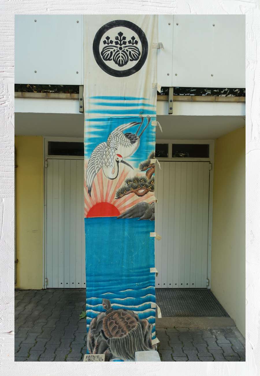 Tempelfahne aus Japan, dem "Land der aufgehenden Sonne" (Ausschnitt, es fehlen oben und unten zusammen ca. 1,75 m), Leinen, handbemalt mit den traditionellen Symbolen (die auch für ein langes Leben stehen): Minogame, Kiefer, Kranich und Sonne, samt altersbedingten Gebrauchsspuren. Es gibt bis heute ein ausgeprägtes Traditionsbewußtsein. Die Fahne ist nicht nur wegen der Größe von 5,32 m x 0,74 m (ohne Schlaufen) ein
