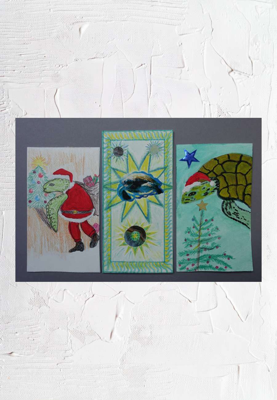 Drei für mich zu Weihnachten gemalte bzw. collagierte Doppelkarten, von Bob, W.E.P. und nochmals Bob.
