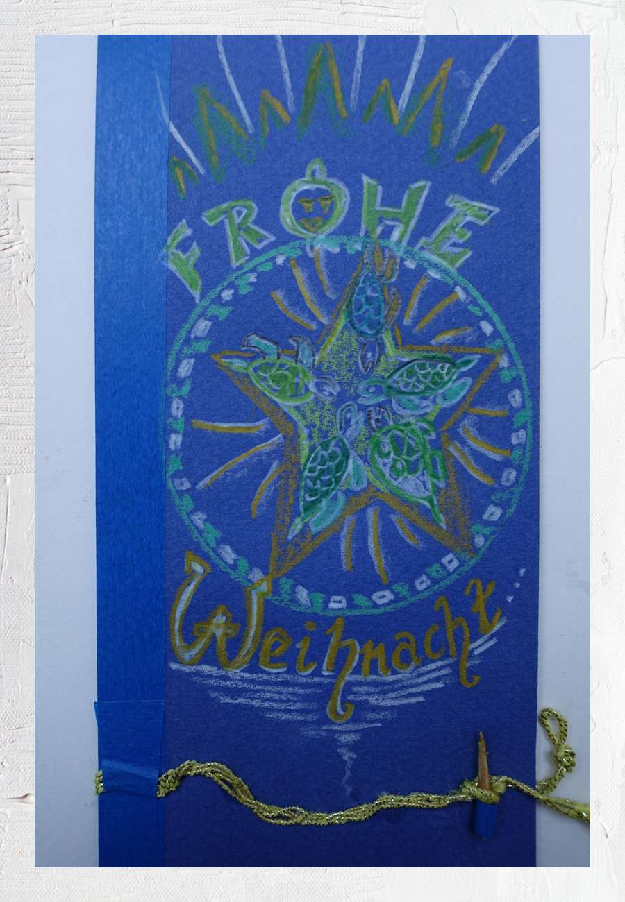 Dreifach gefaltete Karte, Titelseite mit einem ausgefallenem Weihnachtsstern, handgemalt, innen mit einer weiteren Schildkröte (samt Sprechblase) und Grußtext.