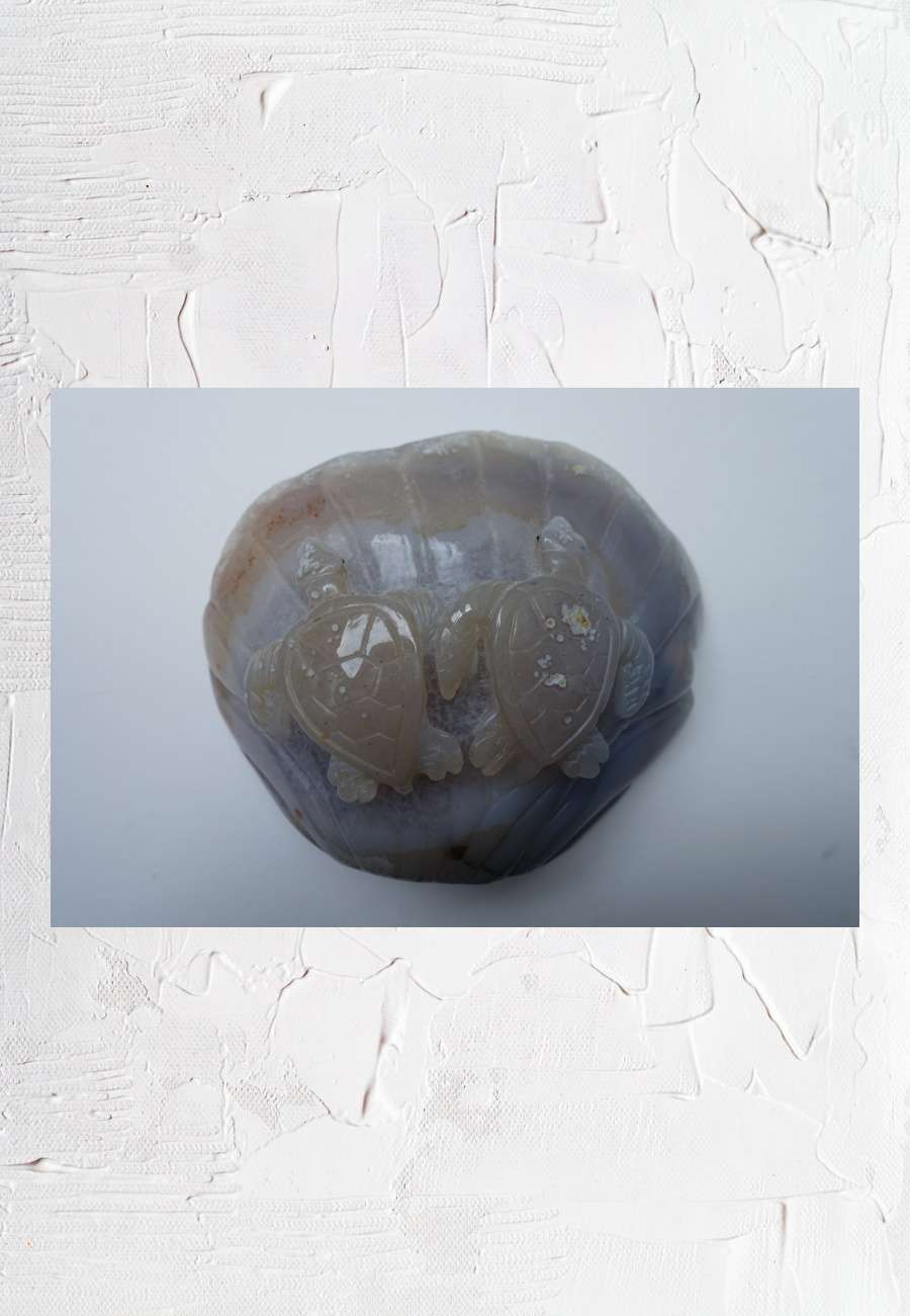 Achat, leicht transparent mit zartem Farbspiel, Muschelform mit zwei herausgearbeiteten Meeresschildkröten, geschliffen und poliert, der Boden des Steines ist naturbelassen, Größe 12 cm.