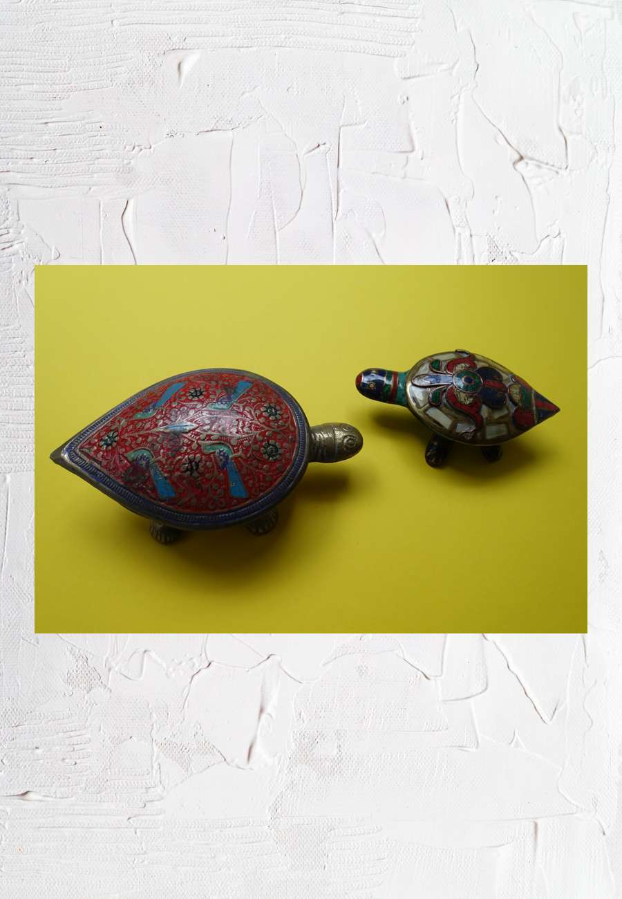 Zwei Messingdosen, Panzer in Tropfenform, innen goldfarben auf Hochglanz poliert, Scharnier jeweils unter dem Schwanzende (beide Stücke direkt über Om Shresta aus Nepal erhalten). Links sind Blüten und Vögel