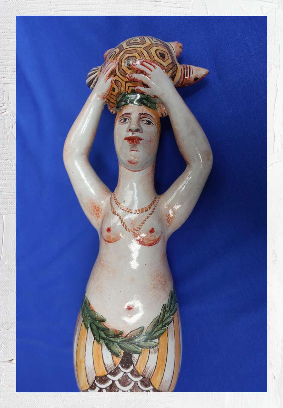 Auftragsarbeit, Nixe (Ausschnitt), Unikat, handgetöpfert und bemalt, sign., Größe 39 cm. Nach einer Töpferlehre studierte die Künstlerin Keramik (Prof. Wetzel und Prof. Möhwald) und anschließend Bildhauerei (Prof. Lichtenfeld) an der